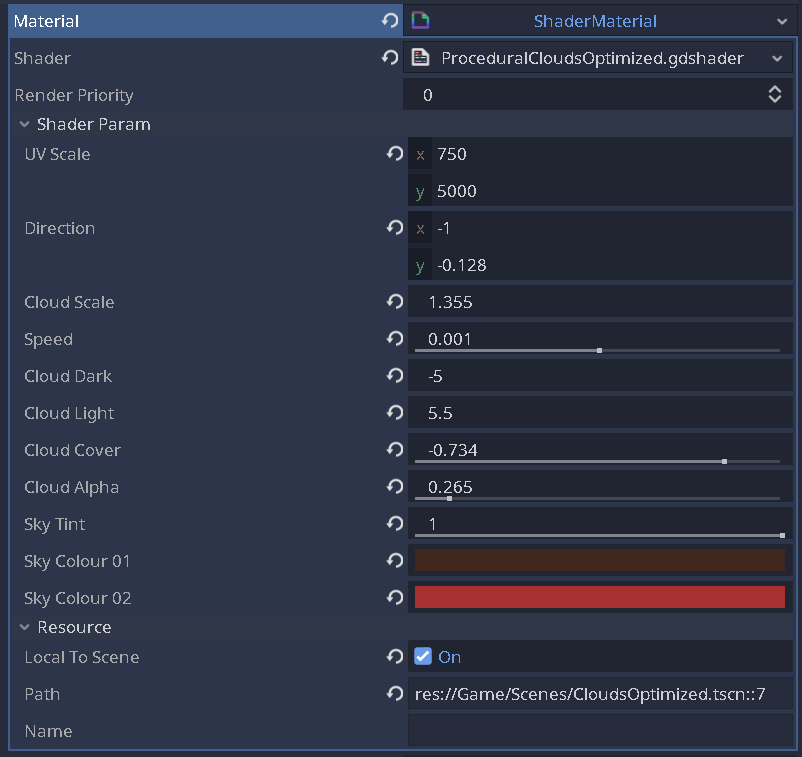 These clouds have a lot of detail and move the fastest across the screen, giving a fake sense of depth. The shader parameters are given below: